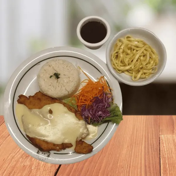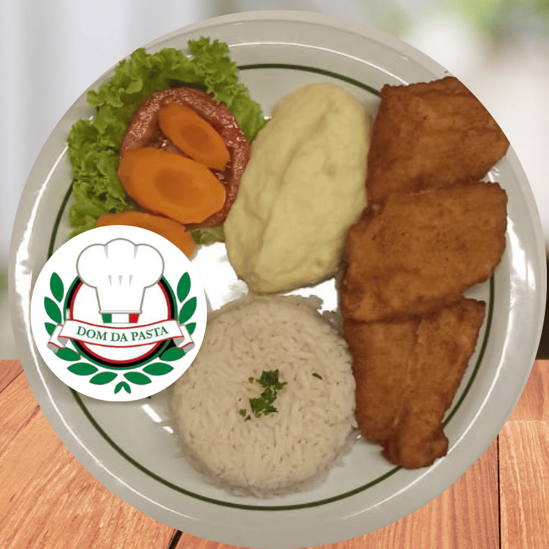 Delicie-se com uma refeição leve e saborosa: **dois filés de peixe empanado** crocantes por fora e macios por dentro, acompanhados de arroz soltinho, **purê de batata cremoso** e uma **salada fresca** para completar. Uma combinação perfeita para quem busca sabor e equilíbrio no prato