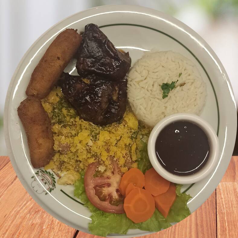 Acompanha arroz, feijão, batata frita e salada.