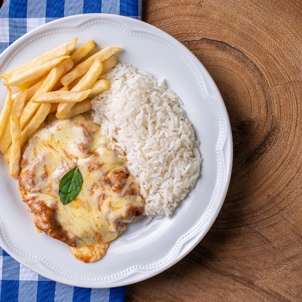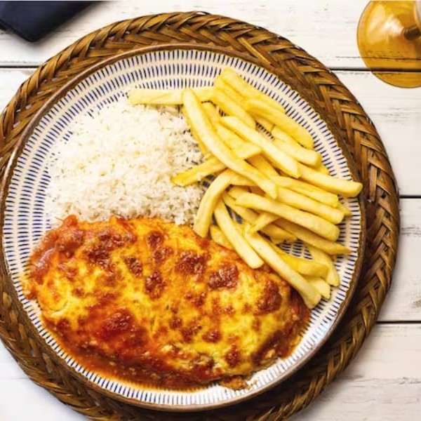 Carne bovina empanada e suculenta, coberto com molho de tomate saboroso e queijo derretido, acompanhado de arroz soltinho e batata frita.- (Serve 1 Pessoa)