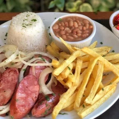 Calabresa frita na chapa, coberta com cebolas douradas, servida com arroz soltinho, feijão cremoso e temperado, e acompanhamentos à sua escolha. (Serve Bem 1 Pessoa)