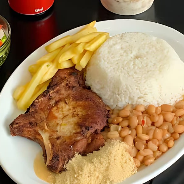Bisteca macia e bem temperada, grelhada até atingir uma crosta dourada e suculenta, servido com arroz soltinho, feijão rico e saboroso, e acompanhamentos à sua escolha.
