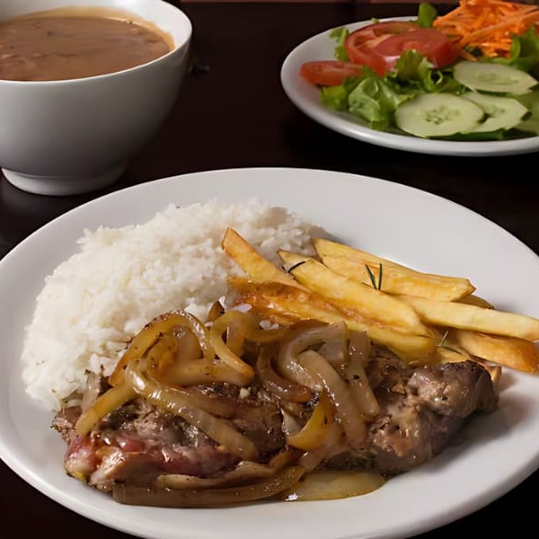 Carne macia e suculenta, coberta com cebolas douradas, servida com arroz soltinho, feijão cremoso e temperado, e acompanhamentos à sua escolha. (Serve Bem 1 Pessoa)