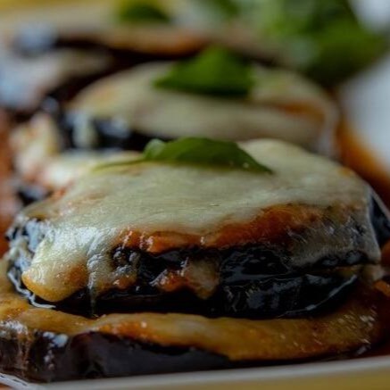 Berinjela assada intercalada com mozzarela de búfala e molho de tomates artesanal, gratinada.