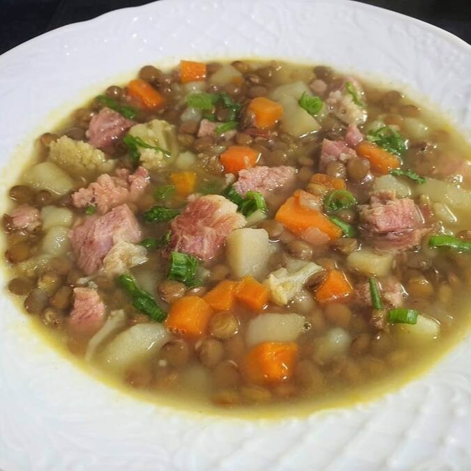Sopa de lentilhas com bacon, cenoura, batata, abobrinha e caldo de legumes.
