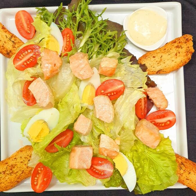 Mix de folhas, ovos cozidos, tomates cereja, cubos de salmão grelhado e 4 torradas de alho * prato individual *foto ilustrativa