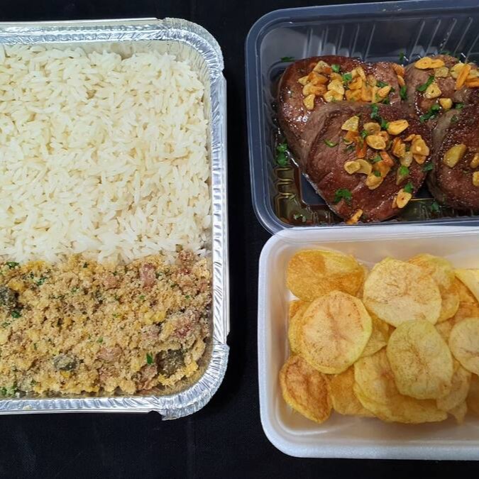 Mignon grelhado (04 medalhões) com alho frito, farofa de ovos com bacon e alcaparras, arroz branco e batatas chips artesanal.