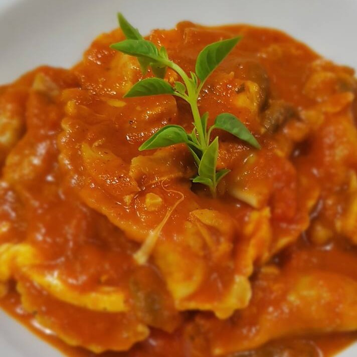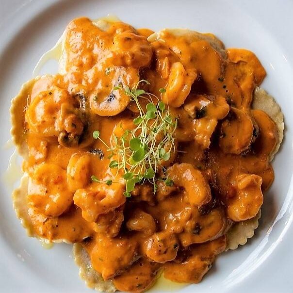 Massa artesanal recheada com camarão e temperos, molho com Camarões médios flambados, tomate concasée, cogumelos frescos e toque de creme.