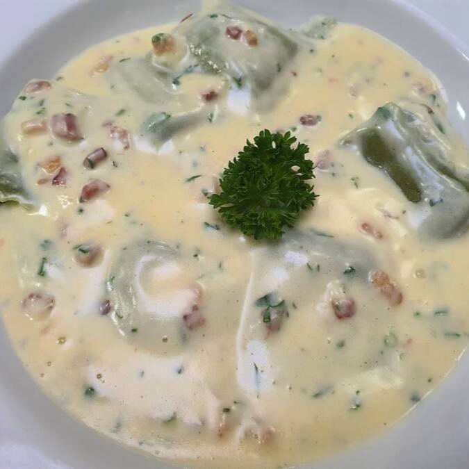 Ravióles Verdes recheados com mozzarela de búfala ao molho Carbonara cremoso.