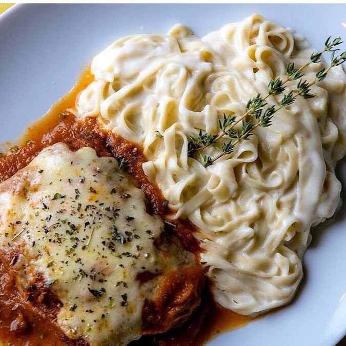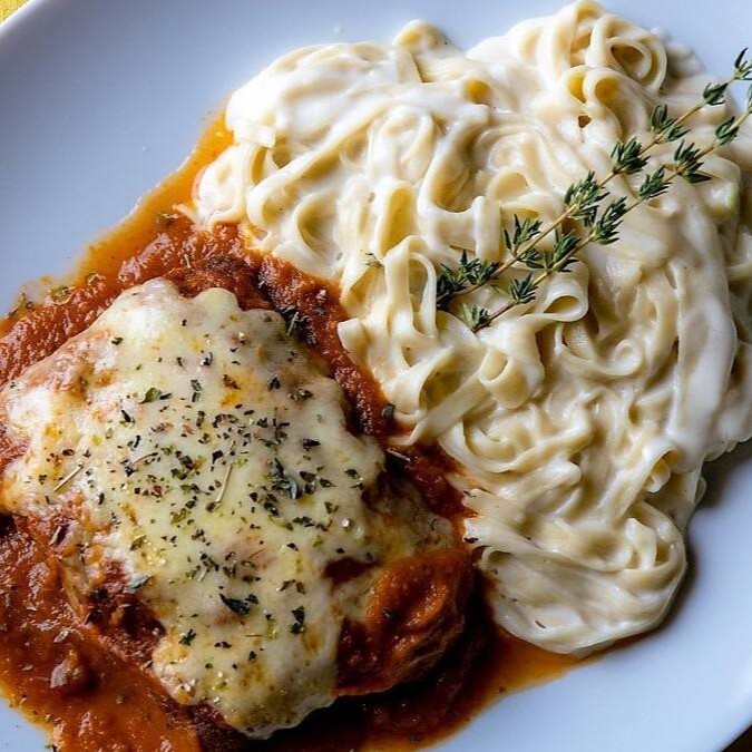 02 Filés (mignon) à Parmegiana bem servido para duas pessoas com molho sugo e gratinado com queijos.