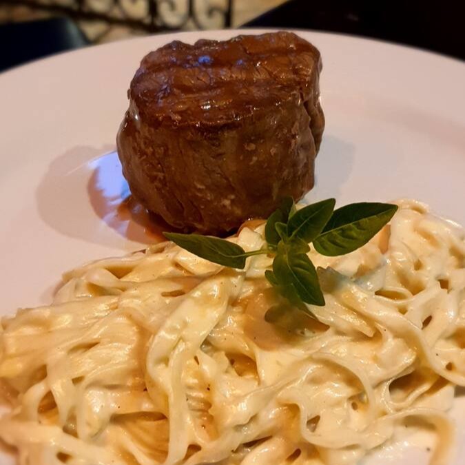 Mignon grelhado ao ponto escolhido. Acompanha fettuccine artesanal ao molho Alfredo.