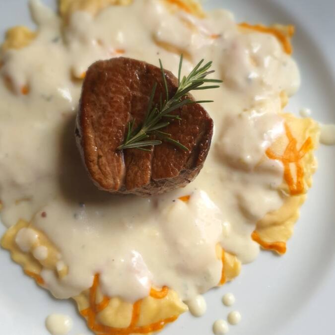Mignon grelhado no ponto escolhido acompanhado de ravióles de queijo brie e pêra ao molho Gorgonzola.