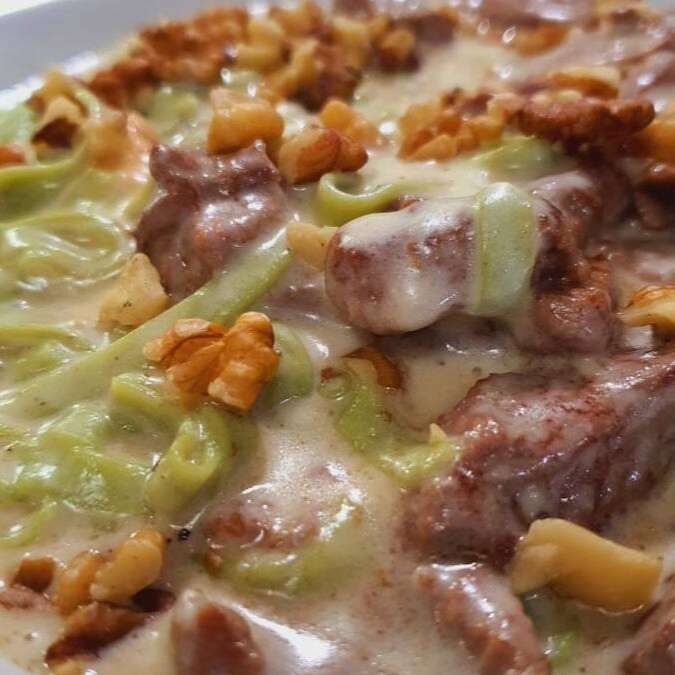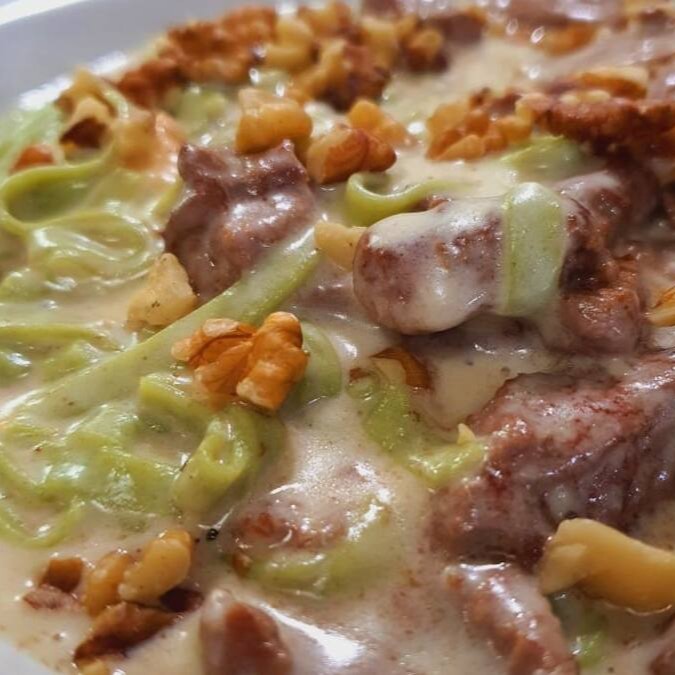 Massa artesanal verde com iscas de mignon e molho de queijos e nozes.