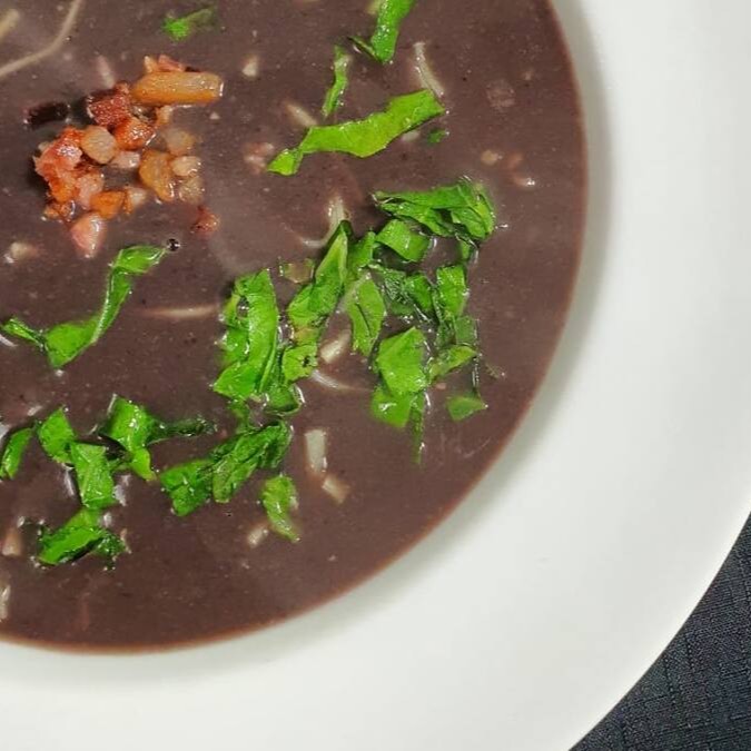 Sopa-creme de feijão preto, com bacon, couve e macarrão.