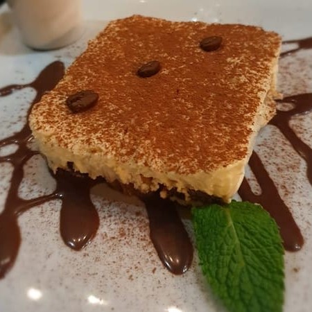 Sobremesa tradicional italiana, bolachas embebidas em cafe e licor de café, com creme de queijo, servida com calda de chocolate artesanal - porção individual