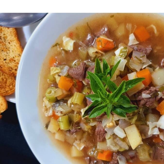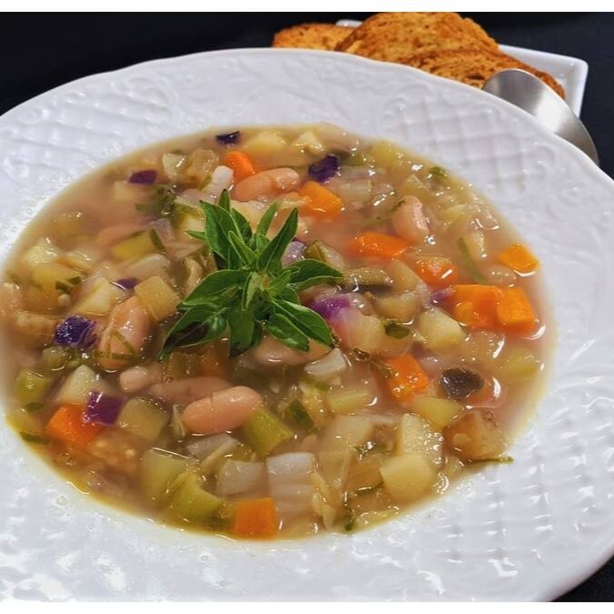 Sopa ao estilo italiano preparada com caldo de carne, legumes, Carne Bovina e couve.