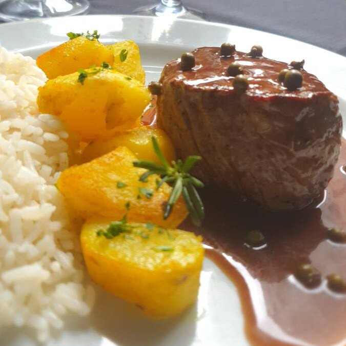 Mignon grelhado (04 medalhões) para duas pessoas, molho de pimenta verde com toque de creme, acompanha arroz e batatas sautée.