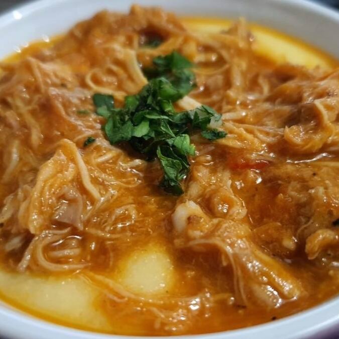 Polenta cremosa com delicioso ragú de frango.