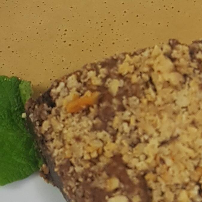 Brownie artesanal de chocolate, coberto com castanhas, servido com creme de café - porção individual