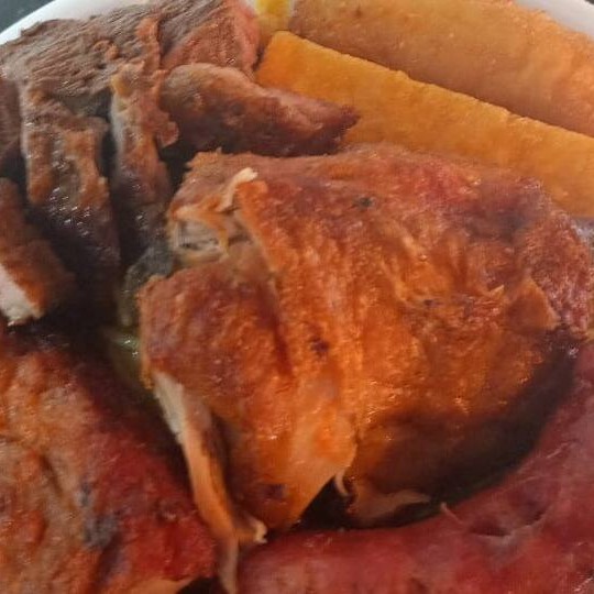 Feijão, Arroz, Farofa, Macarrão alho e oléo, Legumes refogado, Banana a Milanesa e Polenta e 3 Unidades Galeto