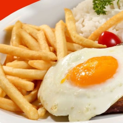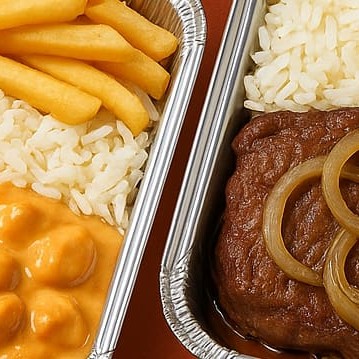 Marmita Deliciosa De Bife a Cavalo Acompanhada De Arroz, Feijão, Macarrão, Batata Frita.
