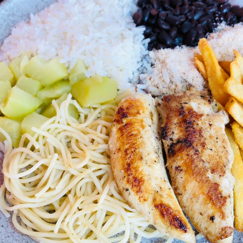 Marmita Deliciosa De Frango Grelhado Acompanhada De Arroz, Feijão, Macarrão e Batata Frita.