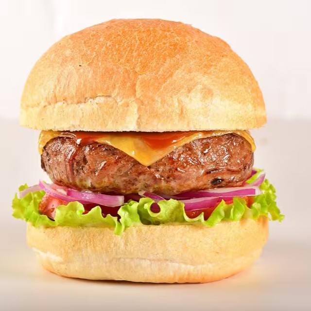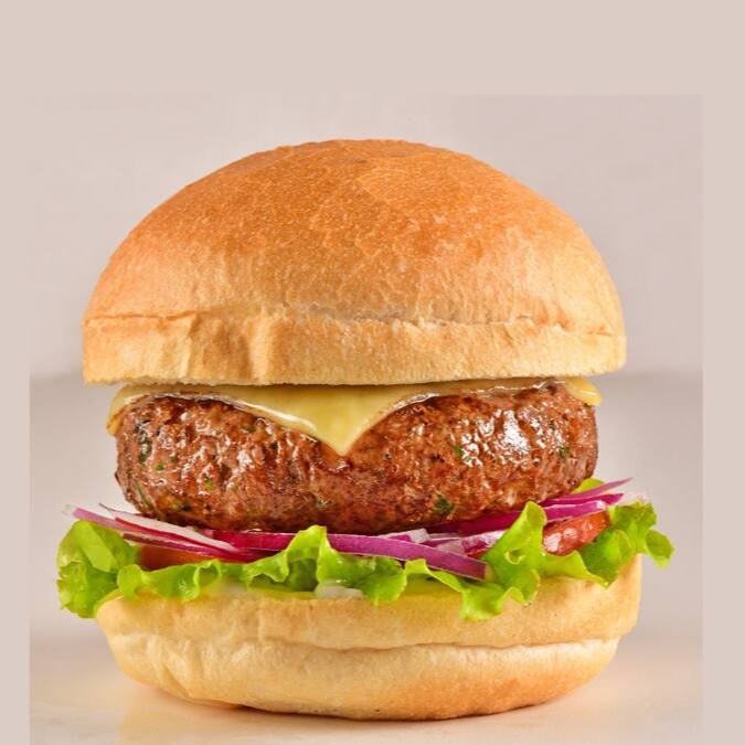 Delicioso hamburguer de Kafta Bovina Angus, queijo prato, feito com pão crocante, alface, tomate, cebola roxa.