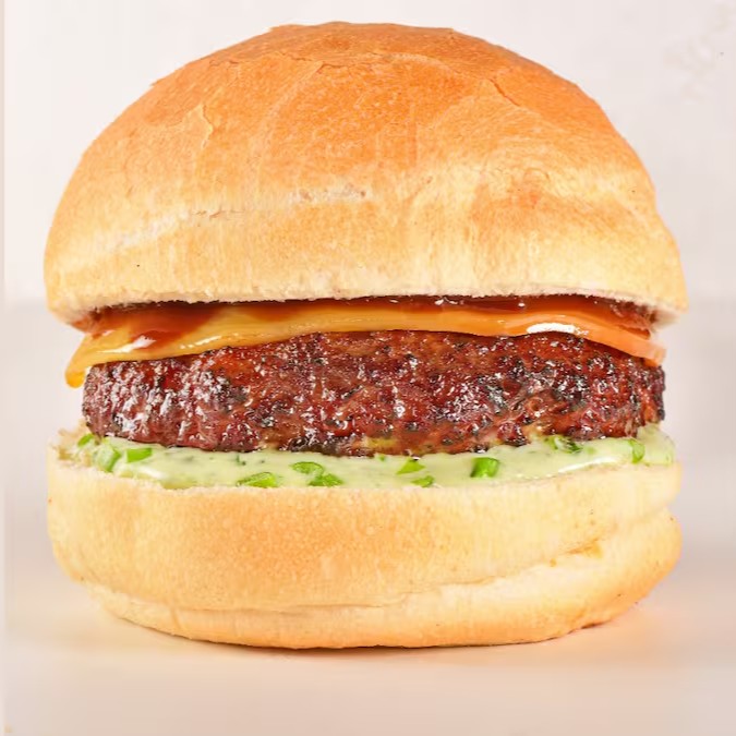 Delicioso sanduiche feito com pão crocante, bolinho de carne temperado, queijo provolone defumado, maionese verde da casa e molho barbecue