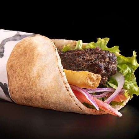 Shawarma / Kebab de Kafta de Cordeiro + Molho Grátis Delicie-se com nosso Shawarma, suculenta Kafta de Cordeiro, feito com pão sírio, alface, tomate, cebola roxa e batatinha frita dentro.