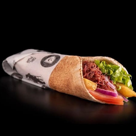Shawarma de Kafta Bovina Angus, sem dúvida um dos mais deliciosos, feito com pão sírio, Kafta bovina de Angus, salada de alface, tomate, cebola roxa e batatinha frita dentro. Acompanha molho de alho grátis!