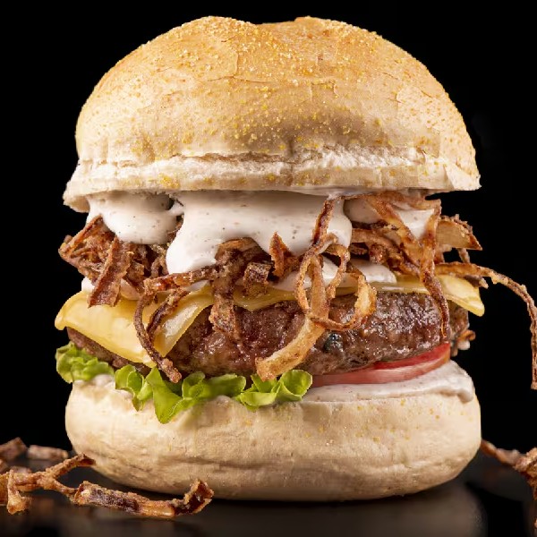Suculento Hamburguer de Cordeiro feito com pão crocante, queijo prato, maionese verde, alface, tomate e cebola crispy.