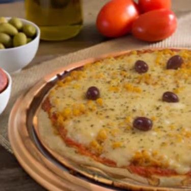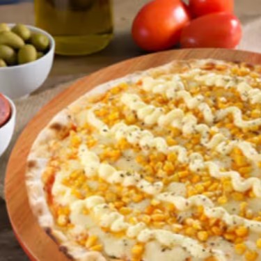 Molho de tomate, mussarela, milho, Catupiry, cebola e orégano