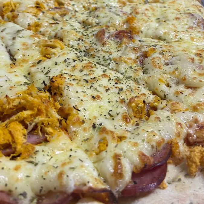 Molho de Tomate, Mussarela, frango, cheddar e orégano