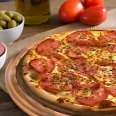 Molho de tomate, Mussarela, Bacon, Tomate, Catupiri e Orégano.