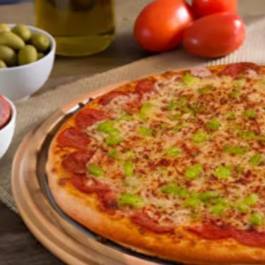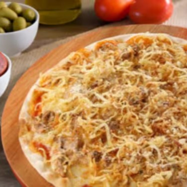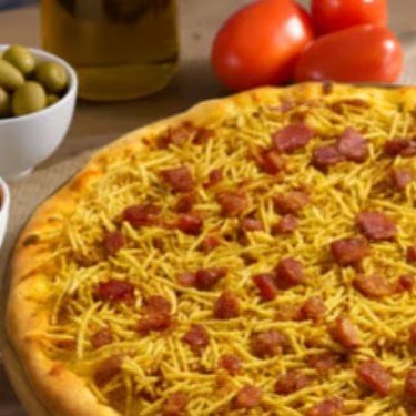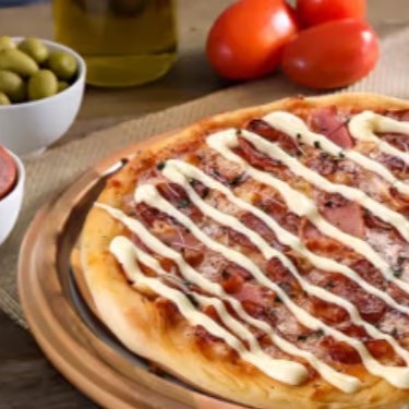 Molho de tomate, mussarela, salame italiano, Catupiry, bacon e azeitonas