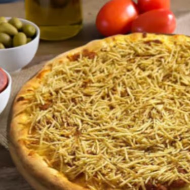 Molho de Tomate, Mussarela, Strogonoff de Frango, Batata Palha e Orégano.