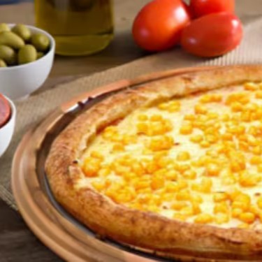 Molho de tomate, mussarela, milho, Catupiry e orégano