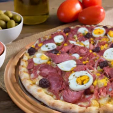 Molho de tomate, Mussarela, Lombo, Calabresa, Ovo, Parmesão e Orégano.