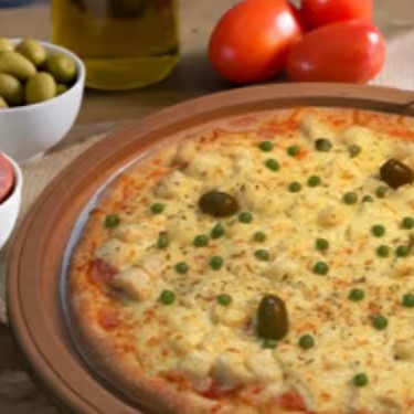 Molho de Tomate, Mussarela, Frango, Tomate, Bacon, Milho, Ervilha e Orégano.