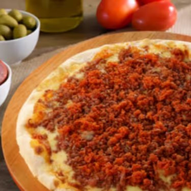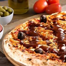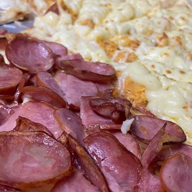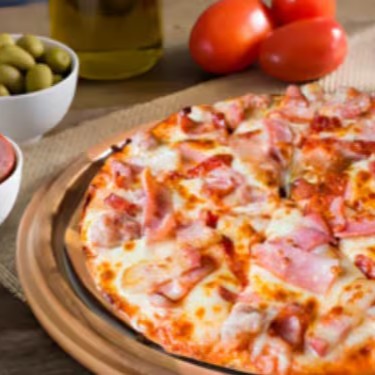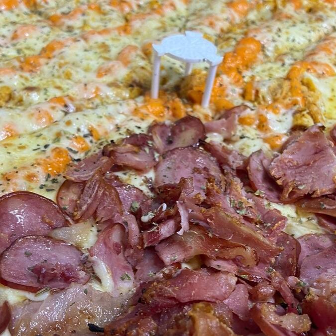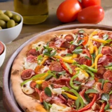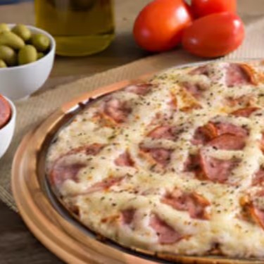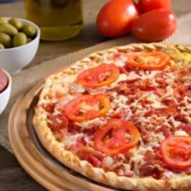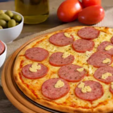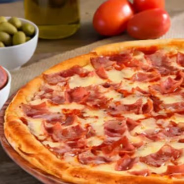 Molho de tomate, mussarela, salame italiano, Catupiry, bacon e azeitonas