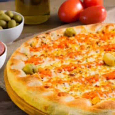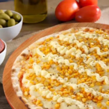 Molho de tomate, mussarela, milho, champignon, tomate, cebola, pimentão e orégano