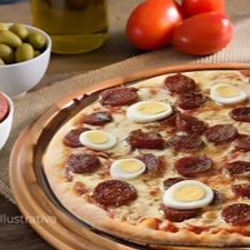 Molho de tomate, mussarela, linguiça Blumenau, ovos e orégano. Foto Ilustrativa