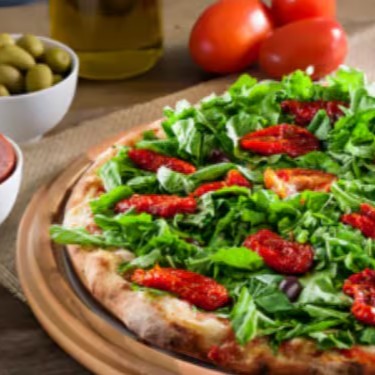 Molho de tomate, mussarela, parmesão, tomate seco, rúcula e orégano