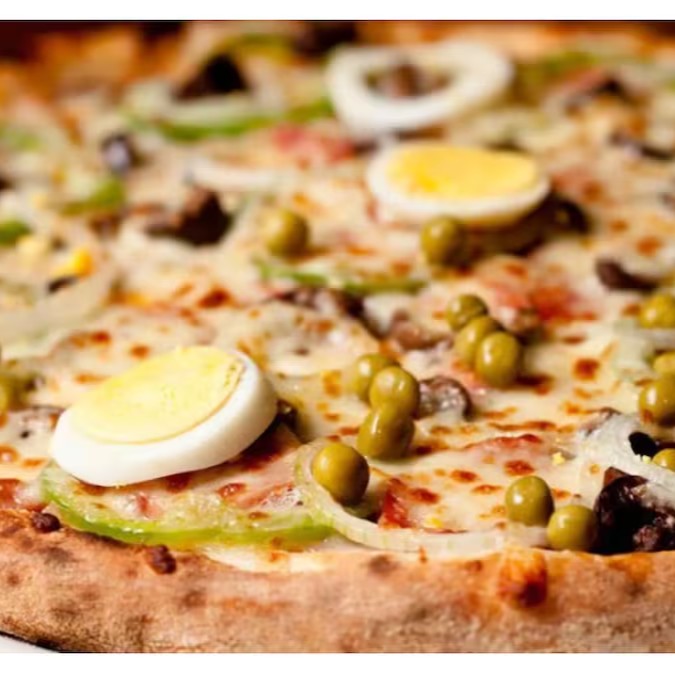 Molho de tomate, mussarela, presunto, ovos, champignon, azeitonas e orégano
