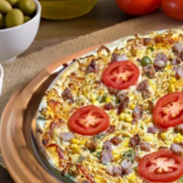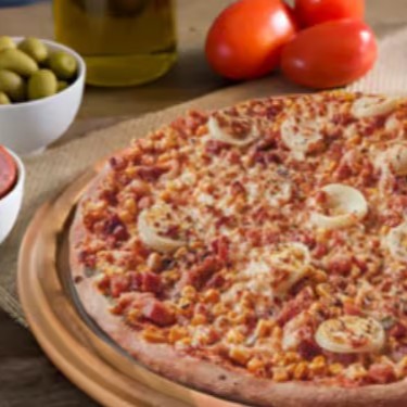 Molho de Tomate, Mussarela, Frango, Tomate, Bacon, Milho, Ervilha e Orégano.