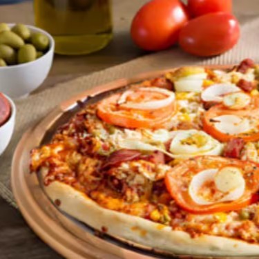 Molho de tomate, Mussarela, Calabresa, Bacon, Tomate, Cebola, Azeitona, Ovo e Orégano.