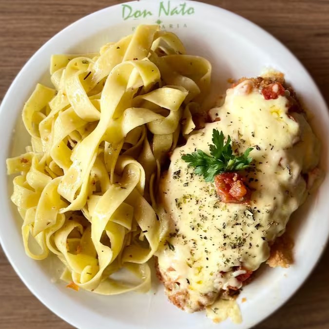 Filé De Frango a Parmegiana Com Macarrão Talarim.