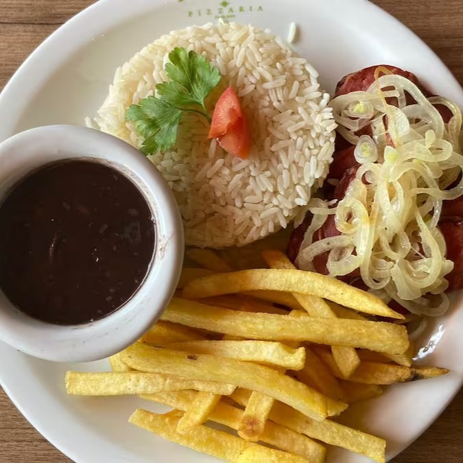 Arroz, Feijão, Batata Frita e Calabresa Acebolada.