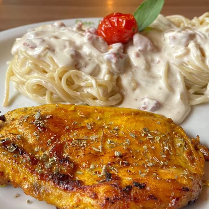 Macarrão Talharim, Molho Carbonara, e Filé De Frango Grelahado Ao Molho De Limão.