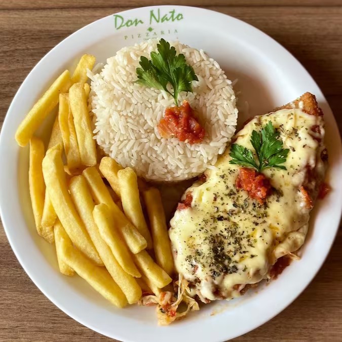 Arroz,Filé De Frango a Parmegiana e Batata Frita.