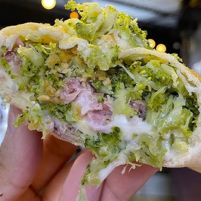 Massa fininha e um incrível recheio de brócolis, Catupiry e bacon.